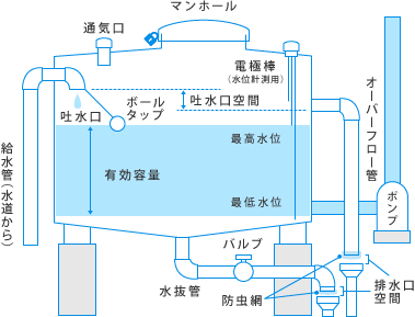 | 高置水槽の水は、停電時でも活用できます。 汚染がなければそのまま利用可能。ただし、災害発生時に施設内の水栓が開いたままだと、 水槽内の水はすぐに無くなってしまいます。 |